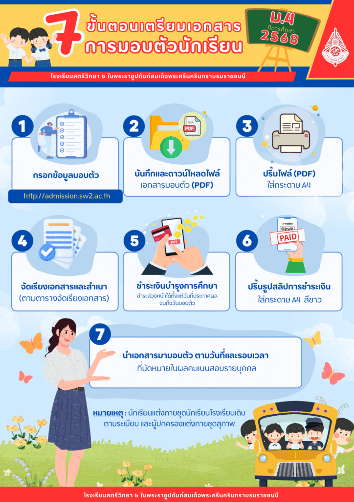 ผู้ปกครองมอบตัวนักเรียน วันพฤหัสบดีที่ 22 พฤษภาคม 2568 ณ ห้องวิชาการ อาคาร 10 ชั้น 2 โดยแบ่งตามรอบเวลาที่กำหนดด้านล่าง (ดูรอบเวลาได้ที่ผลคะแนนรายบุคคล)