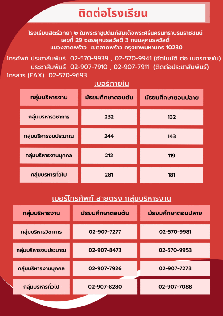 โทรศัพท์: 02-5709939, 02-5709941 (อัตโนมัติ ต่อ เบอร์ภายใน)